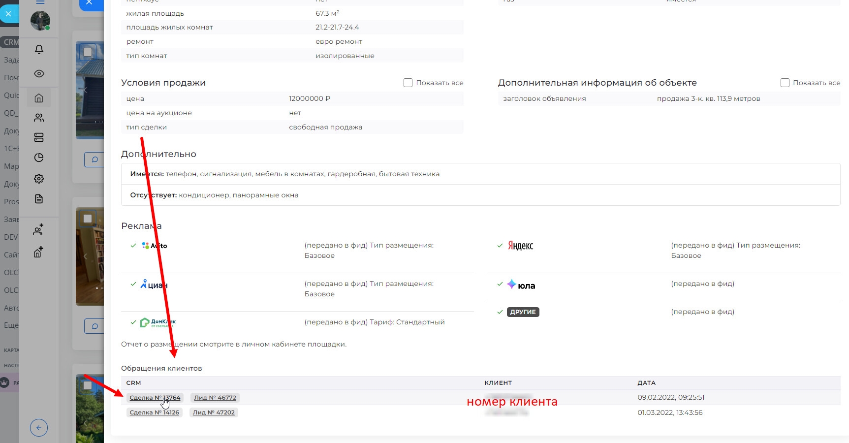 Внизу страницы будут отображаться все клиенты (лиды и сделки), которые интересовались данным объектом.