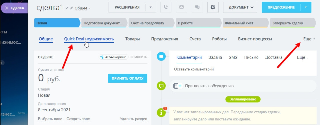 Зайдите в лид, сделку, контакт или компанию и перейдите в детали данной сущности. В окне работы с выбранным CRM нажмите кнопку нашего приложения на панели. Если QuickDeal нет на панели, поищите во вкладке “Еще”. Рекомендуем вынести наше приложение на панель.