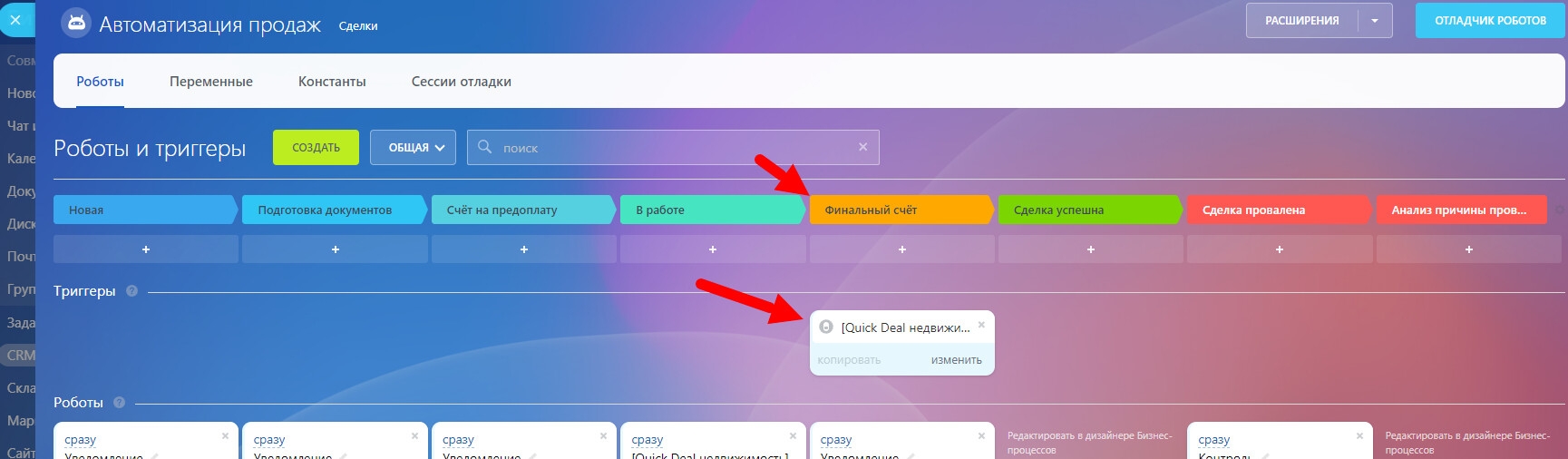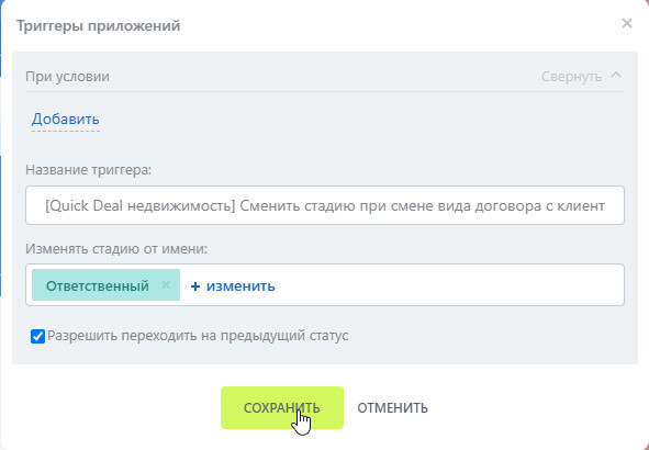 Триггеры работают по принципу противоположному Роботам. В название Триггера написано, на какой статус объекта/заявки или вид договора он среагирует. Перетащите Триггер в нужную стадию воронки. Если объект в QD получит статус или вид договора, который указан в триггере, то в Битриксе лид или сделка перейдет в выбранную стадию воронки.