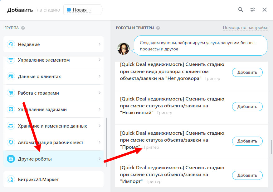 После установки приложения Quick-Deal в Bitrix и привязки к вашей организацией QD у вас появятся новые триггеры, связанные с приложение QD. Все они будут с припиской [Quick Deal недвижимость].