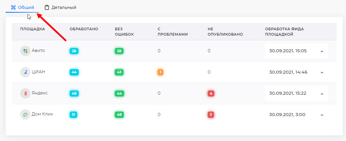 Детальный Подробный отчёт по выгрузке каждого объекта. Детальный отчет можно посмотреть в карточке объекта или в Отчеты=>Реклама=>Детальный.